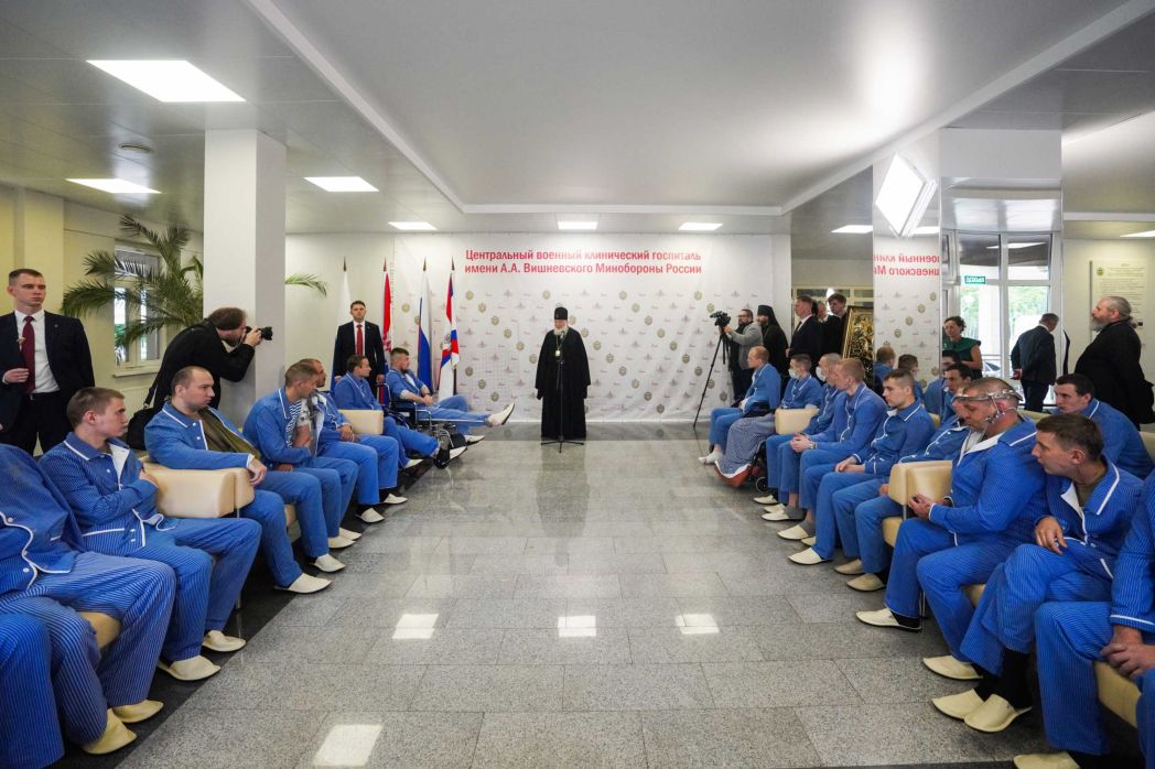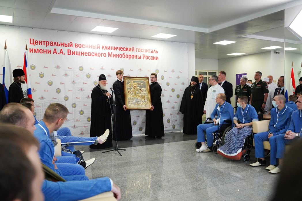 «С особым чувством я посещаю сегодня это медицинское учреждение, которое известно не только по всей России, но, наверное, и во многих других странах мира. Здесь оказывается помощь защитникам Отечества, и значение этого госпиталя особенно возрастает, когда защитники Отечества, осуществляя свой долг, следуя присяге, подвергаются рискам потерять здоровье, получить травмы, которые будут сопровождать их всю жизнь. Поэтому лечение, которое проходят здесь наши военнослужащие, — это не просто лечение физическое. Проникаясь пониманием того, что означает для военнослужащего его служба, исполнение присяги, осознаешь, насколько важно духовное воздействие на человека, находящегося в этих стенах. Очень надеюсь, что наше духовенство достойно осуществляет пастырское попечение и о сотрудниках, и о пациентах — о всех тех, кто нуждается в духовной поддержке.