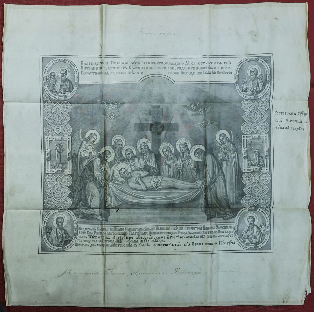 И подарили на прощание от имени духовенства и прихожан епархии драгоценную панагию. С нею одиннадцатого Патриарха Русской Православной Церкви похоронили. Эту панагию нашли в его могиле при обретении мощей святителя 22 февраля 1992 года. К Ярославской земле нас также отсылает и антиминс, освященный тогда еще архиепископом Ярославским и Ростовским Тихоном для теплого придела храма села Зачатье Ростовского уезда. Демонстрировавшийся в прежней экспозиции он представлен и в обновленном музее. Нам эту святыню пожертвовали люди, которые приобрели ее в каком-то антикварном магазине, причем в хорошем состоянии. Это было при наместнике обители епископе Кирилле (Покровском), ныне возглавляющем Ставропольскую митрополию.