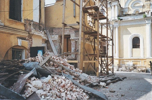 Когда нам наконец передали Воскресенский храм, он был настолько захламлен и обезображен, что пришлось вывезти больше ста грузовиков с мусором. На 1,5 метра пол храма был засыпан, и еще нужно было ломать все перекрытия и перегородки.