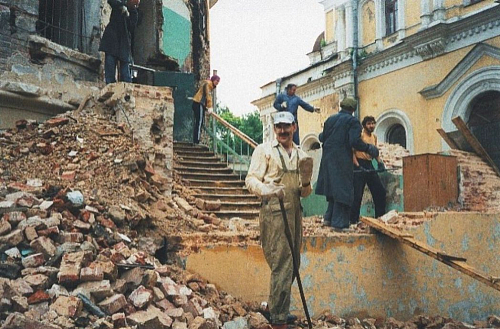 Сначала на восстановление монастыря собирали в метро. В храме установили стекла вместо фанеры, стали выгребать хлам, ломать толстые стеклянные перегородки, на территории сгребали опавшие листья, мусор.