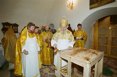 Мы стали скорее готовить храм к первому престольному празднику – Покрову Пресвятой Богородицы. Приехали помогать мои папа с братьями, сделали первый фанерный иконостас, кое-какую мебель, сломали лишние перегородки в храме…