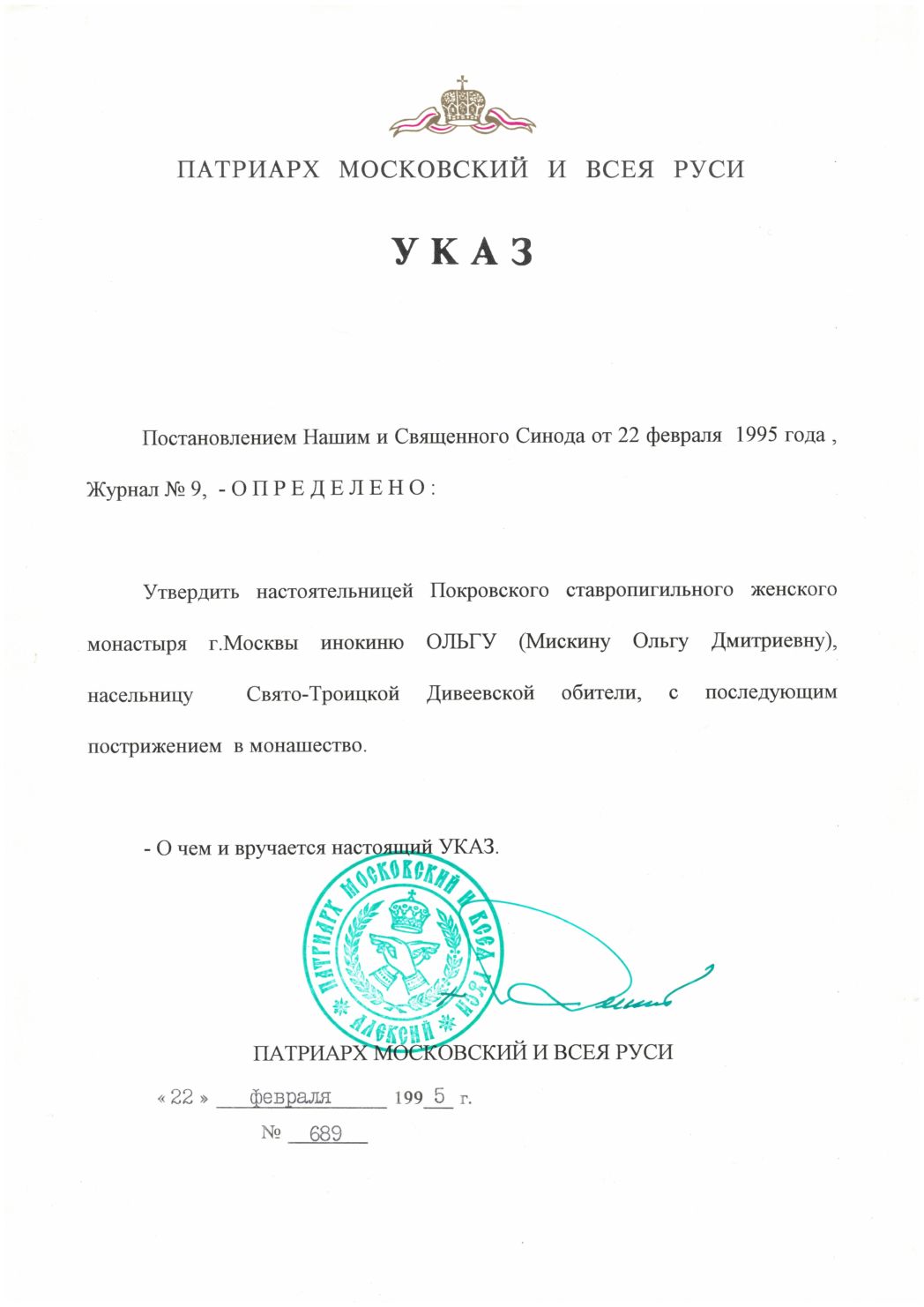 Да, указ о моем назначении настоятельницей монастыря был подписан Святейшим Патриархом Московским и всея Руси Алексием II 22 февраля 1995 года, когда я была насельницей Серафимо-Дивеевской обители.