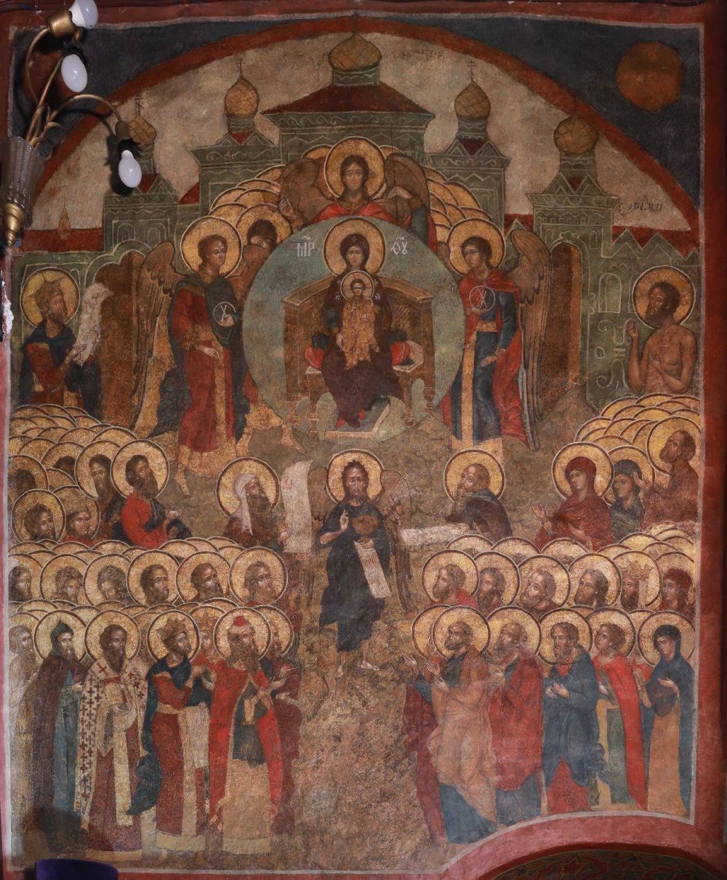 Троицкий собор – это главная святыня Лавры и великая святыня всей Русской Православной Церкви. Вместе с тем это также важный образец раннемосковского зодчества. Храмовой архитектуры рубежа XIV–XV веков сохранилось очень немного; чаще всего это лишь фрагменты фундамента и стен, поэтому Троицкий собор является важнейшим памятником архитектуры и имеет очень большое историческое значение. Безусловно, собор – живое воплощение почтения и любви к преподобному Сергию. В начале XV века Лавра была полностью разорена, и только любовь к учителю послужила тому, что братия вернулась на прежнее место и восстановила монастырь. Так, с древнейших времен Троицкий собор стал особо почитаемым наследием святого. Конечно же, он является и уникальным памятником фресковой росписи и иконописи. Сейчас мы не имеем росписей времени преподобного Андрея Рублева, от них практически ничего не сохранилось. Однако мы знаем от исследователей, Сергея Сергеевича Чуракова (советский художник-реставратор. Член Союза художников СССР. – М. Р.) и иных специалистов, что программа росписей XVII века во многом следовала росписям времени Андрея Рублева. Об этом, в первую очередь, свидетельствует композиционное решение. Конечно, в последующее время были и нововведения, однако бóльшая часть сюжетов – замысел преподобного Андрея. Не могу не поделиться очень важным для нас событием: совсем недавно в процессе реставрации на северном столбе за иконостасом был обнаружен небольшой фрагмент росписи, посвященной празднику Благовещения, который датируется XV веком и может принадлежать кругу Андрея Рублева.
