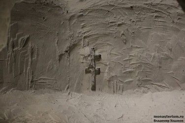 Кстати, в 1997 году наш правящий архиерей – владыка Белгородский и Старооскольский Иоанн освятил на меловых холмах три закладных камня. Один – на месте строительства храма в честь Донской иконы Божией Матери – покровительницы русского воинства. Второй – на месте надвратного храма в честь основателей Киево-Печерской лавры преподобных Антония и Феодосия. Третий – на месте храма-часовни во имя святого равноапостольного князя Владимира. Сейчас эти храмы вы можете видеть во всей их красе, с сиянием золотых куполов. А древний пещерный Свято-Троицкий храм, давший название современному монастырю, – это отдельный разговор. Скажу только, что, начиная с 2011 года, егостены и колонны с усердием очищались от неприличных надписей и выравнивались, а в притворе храма появилась огромная икона Воскресения Христова, вырезанная в меловой породе на стене пещер. В алтаре на горнем месте были вырезана икона Святой Троицы и Распятие. Есть такой замечательный белгородский мастер Сергей Николаевич Золотарев, который приходит сюда работать по ночам, чтобы никто не мешал. На меловых стенах он еще вырезал иконы Рождества Христова, Успения Пресвятой Богородицы, святителя Николая Чудотворца, преподобных Сергия Радонежского, Серафима Саровского и другие. Процесс продолжается. Примечательно, что резные меловые иконы становятся как бы окном в духовный мир для людей, потерявших зрение.