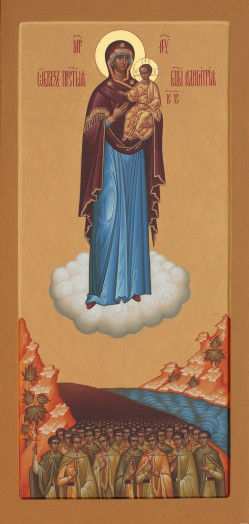 Узнав о благословении митрополита Кирилла построить под Вязьмой монастырь поминовения павших воинов, схиархимандрит Михаил первым делом наказал нам написать икону Божией Матери «Одигитрия – Вяземская ратная». Благодаря тому, что в монастырь из года в год приезжают паломнические группы и благодаря, конечно, средствам массовой информации сегодня предыстория появления этой иконы стала широко известна. Но мне думается, будет уместно ее вкратце повторить. Воевал тогда Виктор Балаев подо Ржевом. Увидев на груди Виктора, будущего старца Михаила, нательный крестик, один солдатик решился ему рассказать, как он и другие бойцы сумели вырваться из «Вяземского котла». На вечер был назначен прорыв немецкой линии, однако вражеский огонь не прекращался. И вдруг солдаты увидели женщину в темной одежде – то ли в накидке, то ли в широком плаще. На руках она держала ребеночка. Женщина пошла по тропинке и как будто рукой звала за собой. Солдаты подумали, что это местная жительница, знающая дорогу. Пригнувшись, побежали за ней. Бежали-бежали, потом увидели, что она скрылась за кустиками и совсем исчезла из вида. Тогда только они поняли, что это была не простая женщина…Схиархимандрит Михаил дал благословение написать икону, на которой Божия Матерь представлена во весь рост, парящей на облаке, с Предвечным Младенцем на руках. Под ней между символических холмов текут две реки – земная и небесная. Первая – из тысяч воинов, мучеников, павших за Отечество. Они изображены без головных уборов, в гимнастерках, в плащ-палатках, с крестами в руках. Вторая река уносит души погибших на небо. Я тогда спросила у батюшки, почему красноармейцев, среди которых наверняка было немало комсомольцев и коммунистов, надо изображать с крестами? Батюшка сказал слова, запомнившиеся мне на всю жизнь: когда наступает последняя минута, все мы становимся верующими. (Кстати, известно предание, что еще при Екатерине II воина, погибшего на поле брани за Отечество, считали мучеником. Он не святой, но – мученик. Вот и эти тысячи и тысячи бойцов приняли мученическую кончину).
