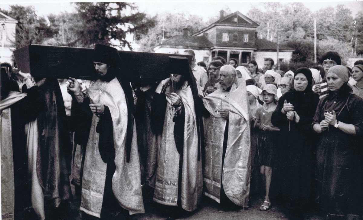 Должен сказать, что до нас здесь какое-то время подвизался иеромонах Иосиф (Братищев), ставший впоследствии наместником возрождающегося Спасо-Преображенского Соловецкого ставропигиального монастыря. Его направили сюда со строителями из Управления по реставрации и строительству Московского Данилова монастыря, и где-то они произвели ремонт, что-то подновили, облагородили. Отец Иосиф входил во взаимодействие с государственной властью, с местными жителями, подготавливал почву для возобновления монашеской жизни. Он был как форпост – передовой пункт, начало и оплот в развитии. Видимо, это его заслуга, что в надвратной церкви в западной башне, увенчанной фигуркой трубящего Ангела, появились фанерный иконостас, временный престол, жертвенник. И вот там первое время совершался весь круг суточных богослужений, начавшихся после нашего приезда. Сразу, как только мы прибыли и пообедали, отец-наместник благословил нас собраться за Введенским собором у того места, где упокоилась большая часть оптинских старцев. Мы отслужили панихиду, а вечером было всенощное бдение. На следующий день – в праздник Владимирской иконы Божией Матери – архимандрит Евлогий совершил освящение храма иерейским чином вместе со своим братом протоиереем Вадимом Смирновым, позже принявшим монашество с именем Никон и ставшим настоятелем Московского подворья Афонского Пантелеимонова монастыря. (Сейчас отец Никон подвизается на Святой Горе Афон). Затем они отслужили первую Божественную литургию. Службы пошли ежедневно: утром и вечером, утром и вечером… И каждый день были причастники! Выглядело это интересно: одна цепочка спускалась вниз по ступенькам храма – к запивке, другая цепочка поднималась по ступенькам вверх – к Чаше. Между службами привлекались к труду паломники, потому что крутые деревянные лесенки нужно было подмести, промыть. Только успеют сделать уборку в храме, начинается следующая служба. А когда пройдет по ступенькам человек 80 – то вниз, то наверх, снова надо убирать. Я хорошо запомнил 6 июня 1988 года. В Троице-Сергиевой лавре открылся Поместный Собор, приуроченный к 1000-летию Крещения Руси, а к нам в этот день пришло очень много народа и было более 40 причастников. В какой-то момент появилось ощущение, что плотина, долго сдерживавшая воду, рухнула. С одной стороны, советская власть еще была, был еще жив Советский Союз, но стало очевидным, что уже никак не удержать религиозно-церковную жизнь.