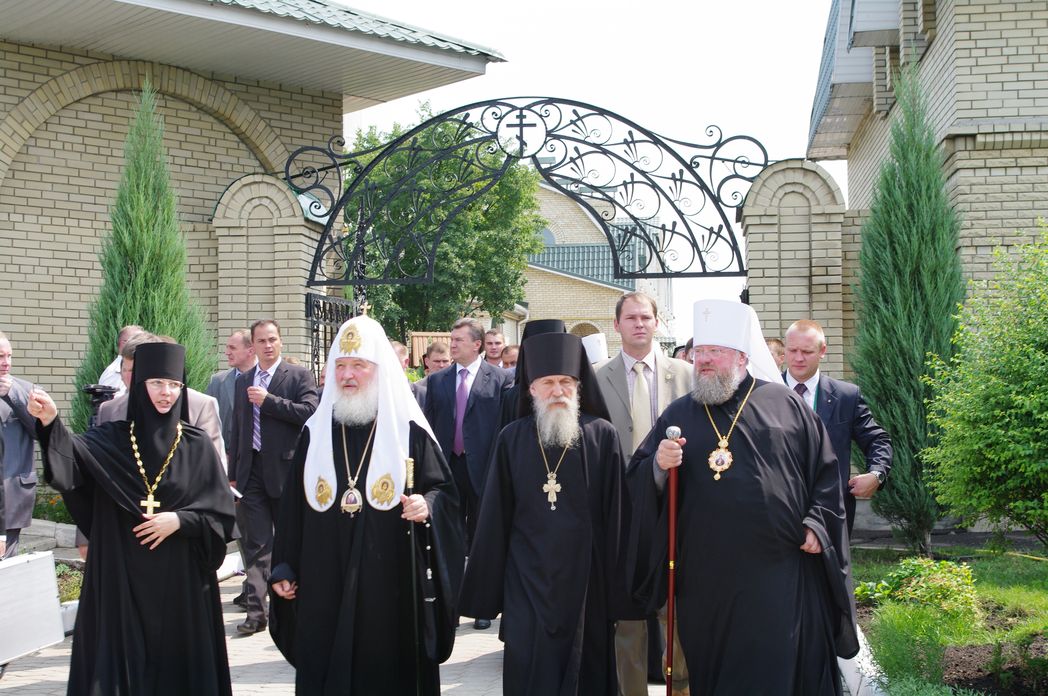 ...В соборе Святейшего встречали сонм архиереев, священников и прихожане обители. Было совершено малое освящение собора, затем все прошли к часовне, где похоронен наш старец Зосима, отслужили заупокойную литию. Потом направились в Трапезный храм на праздничную трапезу. Я шла рядом с Патриархом, мы очень тепло общались: он спрашивал меня о моем образовании и о том, чем и как мы занимаемся с сестрами. Я рассказывала об устройстве монастыря, о назначении близлежащих корпусов, показывала их. После этой беседы у меня исчезло внутреннее напряжение, поскольку я четко и ясно осознала, что рядом наш отец, который глубоко во всё вникает и искренне интересуется нашей жизнью. После трапезы мы подарили Его Святейшеству изображение Успения Божией Матери, изготовленное руками сестер. В память о посещении обители Патриарх Кирилл подарил нам старинный образ Успения.