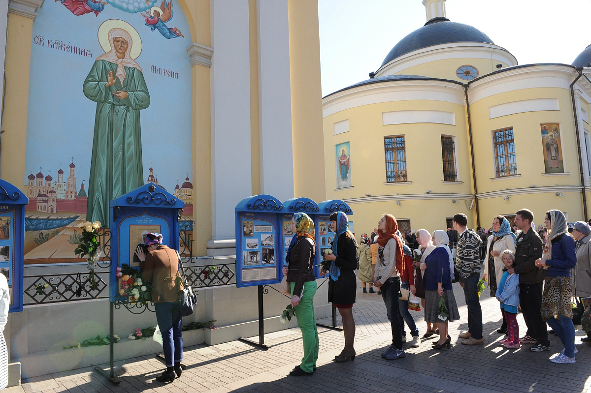 А в праздники и дни памяти блаженной Матроны сестрам приходится вставать очень рано. В эти дни открыты все четыре храма: Воскресенский, Покровский (второй этаж), храм Петра и Февронии. Первый этаж Покровского храма, где почивают мощи блаженной Матроны, открыт всю ночь. По причине огромного количества паломников, на монастырской площади устанавливается большой экран, на котором транслируется богослужение. Монастырь организует благотворительную трапезу на 20 000 человек (обед – каша, соленья, консервы, чай с булочкой). Также в монастыре ежедневно открыта Монастырская трапеза, где все паломники могут перекусить или пообедать. На территории монастыря имеется большая церковная лавка и несколько свечных ящиков, где прихожане могут приобрести церковную утварь и литературу. Заказать требы и купить свечи можно в любом храме обители.