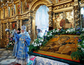 Главный соборный храм и вся обитель были посвящены Небесной Покровительнице древнего Смоленска – Божией Матери Одигитрии (Путеводительнице). 28 июля 1525 года по приказу Василия III сюда из Благовещенского собора Кремля была перенесена Смоленская икона Богородицы, одна из главных московских святынь. Вот уже почти пять столетий чудотворный образ находится в местном ряду иконостаса слева от Царских врат.