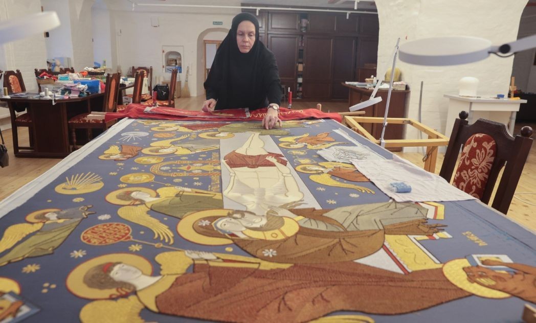 Святейший Патриарх Кирилл посетил выставку произведений современного церковного искусства, на которой представлены богослужебные предметы из монастырской ризницы: комплекты покровцов и воздухов, шитые пелены и иконы, митры, епитрахиль с поручами, изготовленные сестрами нашей обители. Это – уникальные вещи, каждая из которых имеет свою историю. Некоторые являются воссозданием древних образцов лицевого шитья. Замечу, что наша золотошвейная мастерская – не коммерческий проект. Ее изделиями пополняется монастырская ризница. Сестры работают вручную, и процесс этот долгий и трудоемкий. Самая большая награда для них – видеть вышедшие из-под их рук изделия на Святом Престоле в алтаре во время богослужения.
