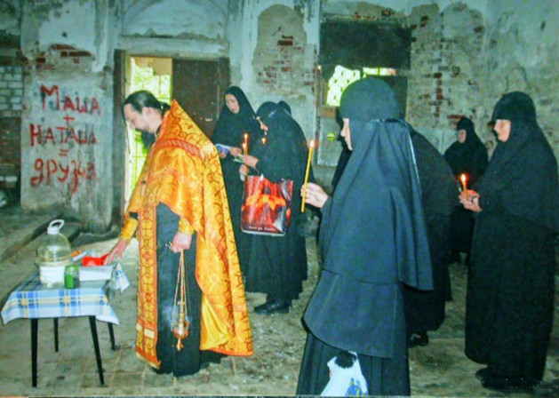Конечно, тяжело нам было, что говорить. Прибыли мы вдвоем с молодой инокиней Афанасией (Козловой) – жить негде, средств нет, благодетелей нет. Первые два года жили на квартире, пока не был возведен небольшой деревянный дом для сестер. Владыка благословил начать восстановление монастыря с кладбищенской церкви Вознесения Господня, потому что в сравнении с монастырскими храмами она сохранилась лучше. К тому же земля вокруг нее оказалась свободной от городских построек типа ПТУ, общежития, гаражей, какие в нарушение всех норм строительства (ведь это была охранная зона с памятниками архитектуры!) появились на монастырской территории. Должна заметить, что мы все время служили. Всегда в воскресные дни совершали акафист апостолам Петру и Павлу. Даже в 32-градусный мороз, когда обогреватель не помогал, поскольку в храме было много дыр и вода, стоявшая выше чем по щиколотки, превращалась в лед. Просто такого священника Господь послал – ревностного. Он приходил, я у него спрашивала: «Батюшка, как быть? Холод-то какой!», но он решительно отвечал, что надо служить. И служил. Причем поверх епитрахили не надевал теплую одежду. А лед мы с матерью Афанасией – сколько хватало сил – разбивали ломом, вытаскивали его из храма. Позже вычинку кирпичной кладки сделали, все нормализовалось. Еще одна напасть нас мучила на первых порах: ночной клуб под боком, заложниками которого мы были до тех пор, пока его не закрыли. Видимо, в увеселительном учреждении спиртные напитки стоили дорого, и его завсегдатаи приходили на выделенную монастырю территорию со своим вином или водкой и здесь распивали. Среди них находилось немало любителей разбивать пустую стеклянную тару вдребезги. Мы ходили и мешками собирали пластмассовые бутылки, осколки. Сколько мешков отсюда выгребли!