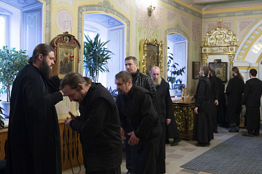 Что касается Устава богослужебной жизни, мы его взяли из Оптиной пустыни. Богослужебный день братии начинается с чтения молитв из утреннего правила, полунощницы и молебна перед чтимой святыней. В Оптиной он совершается перед мощами преподобного Амвросия, у нас – перед чудотворной Грузинской иконой Божией Матери. Затем идет Литургия, вечером – вечерня, повечерие и утреня. Не во всех монастырях служат каждый день повечерие, но мы служим. И обязательно с каноном Божией Матери – по Богородичнику – соответственно гласу Октоиха и дню недели: 56 богословски насыщенных текстов, творения древних песнотворцев. Раз в неделю, в субботу, совершаем вечернее правило с чтением молитв к исповеди и причастию. Вся братия исповедуется и на следующий день, в воскресенье, причащается. Также все причащаются на великие праздники и престольные праздники обители. Исповедуется братия у меня. Как написано в«Положении о монастырях и монашествующих» (и к чему, кстати, пришли после долгих дискуссий), духовником в монастыре должен быть игумен, если братии не так много. Если много, тогда игумен может избрать себе помощника. У меня тоже есть помощник в окормлении братии – иеромонах Макарий (Семенов), однако тех, кто только пришел – трудников и послушников, – я стараюсь исповедовать сам, чтобы знать внутренний мир человека и, пока он «младенец» в духовном плане, помочь ему. А когда укрепится, можно его немножко отпустить. Эту практику мы переняли из Оптиной пустыни, где, как я уже говорил, наместник отец Венедикт сам вел новоначальных. Брал человека и, образно говоря, словно бриллиантику после огранки, находил ему достойное место в короне.