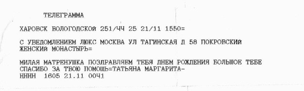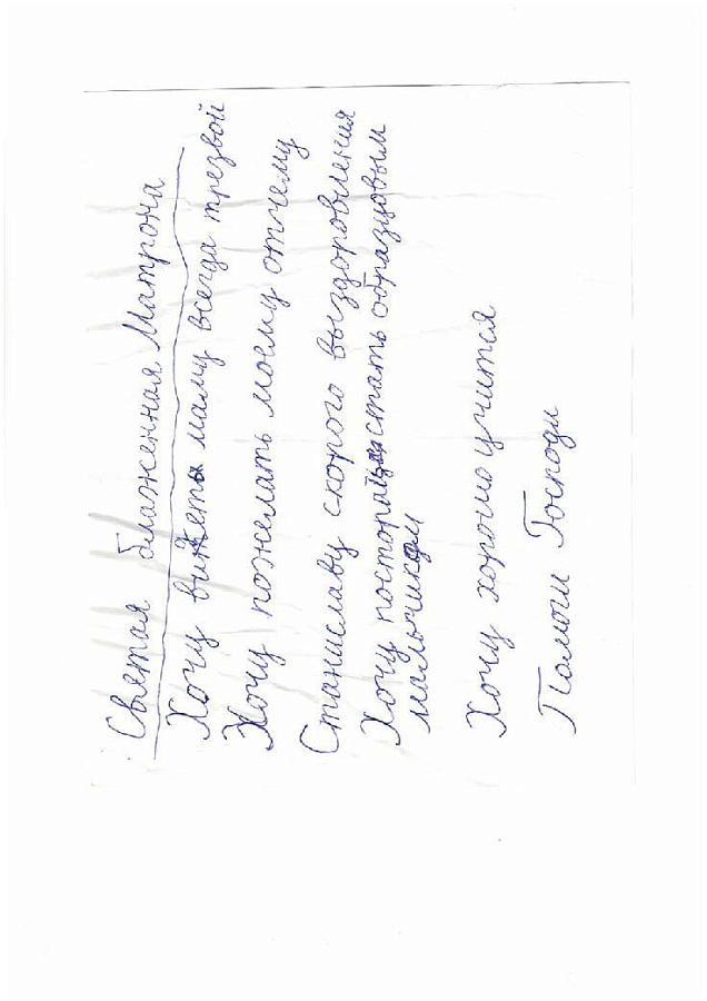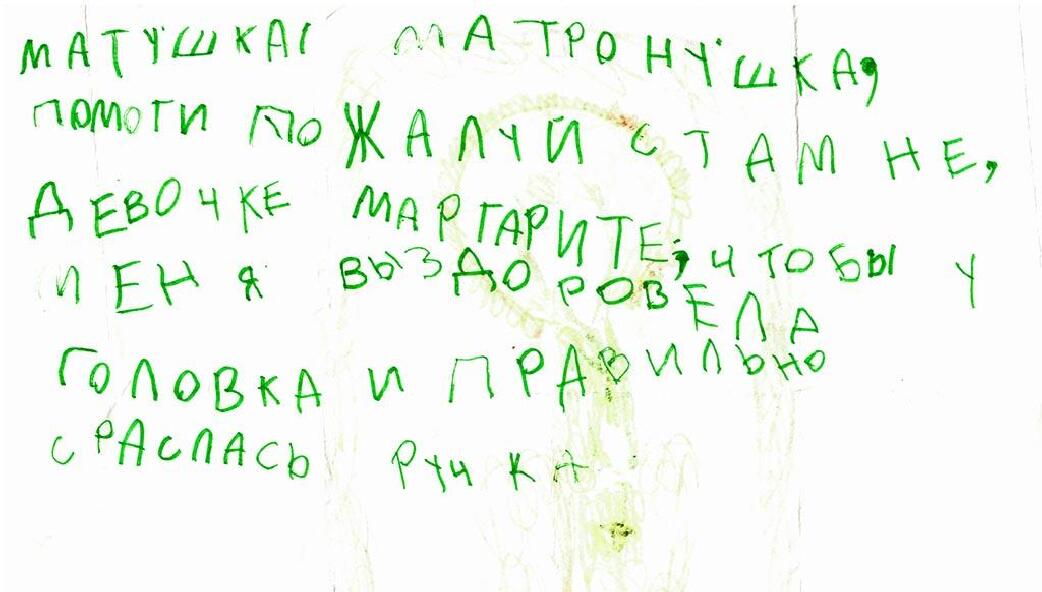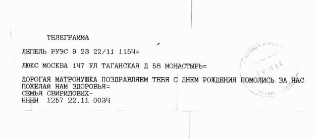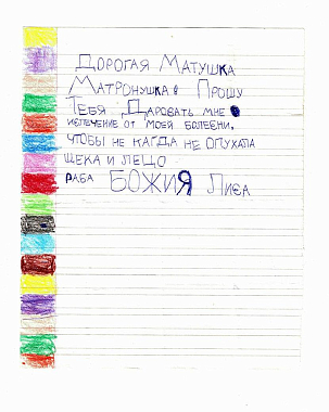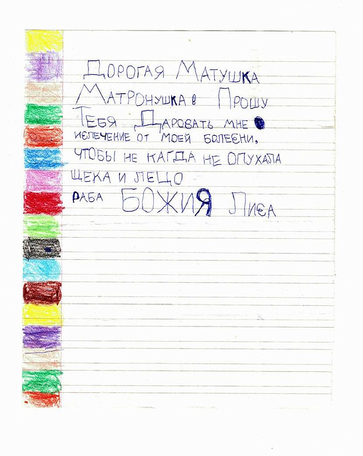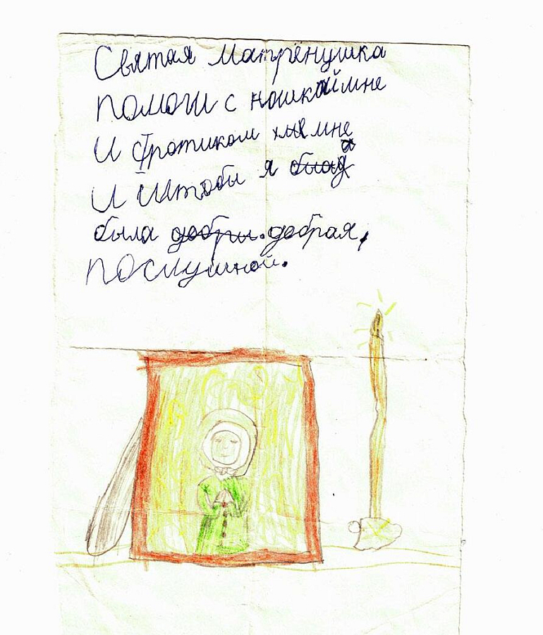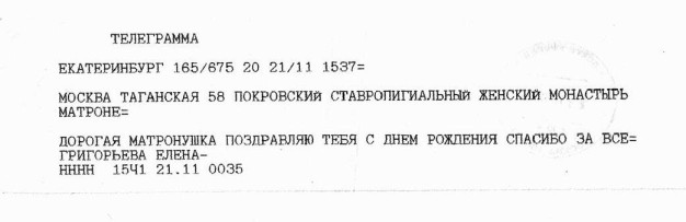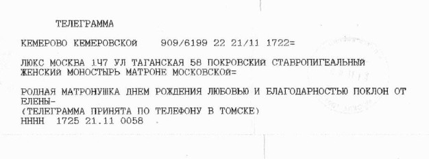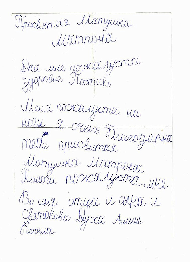 Люди обращаются к Матронушке, как к живой, присылают ей телеграммы: «Милая Матронушка, у нас отбирают квартиру, помоги, защити!», «Святая Матрона у нас сегодня состоится суд, управь все хорошо», «Помолись пожалуйста Матронушка, ребенок в тяжелом состоянии».
