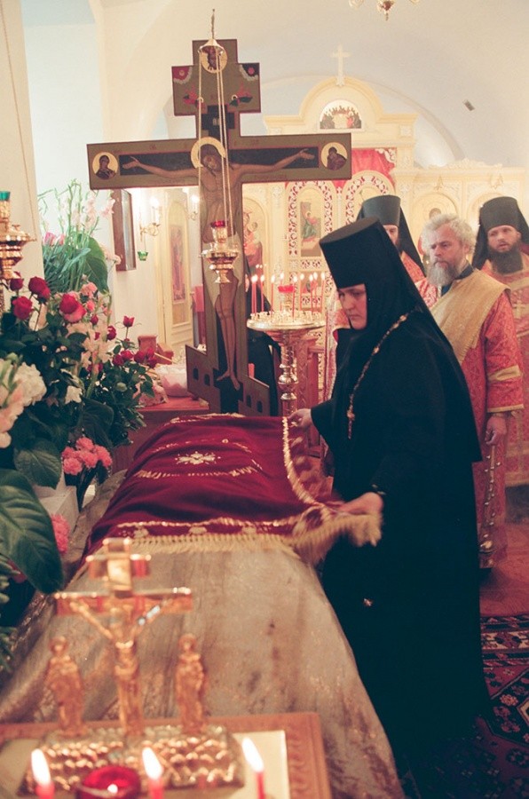 Такое решение и благословение было дано лично Святейшим Патриархом Алексием II. В начале марта, за неделю до обретения мощей, мне позвонили из Патриархии и сказали, что 8 марта нужно подготовить кладбище, приедет комиссия для обретения мощей. Я никому ничего не сказала, даже сестрам, и поехала. С администрацией кладбища мы заранее договорились, чтобы его закрыли в 17 часов. С 17 часов до 19 мы все убрали с могилки. Крест, который стоял на могиле, сейчас находится у нас в монастыре в правом приделе Покровского храма.