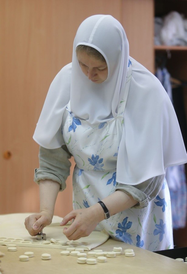 В числе других сестер инокиня Иулиания встает к разделочному столу: с одной стороны разделывается тесто на «верхи», с другой – на «низы». Процесс конвейерный: кто-то режет, кто-то складывает отпечатанные «верхи» на доски, остальные ставят печати. Выпечка просфор на самом деле содержит много деталей и тонкостей и требует ювелирного мастерства, ловкости рук, точности, скорости, быстроты реакции. Фотограф едва успевает запечатлеть все нюансы – так быстро движется «конвейер».