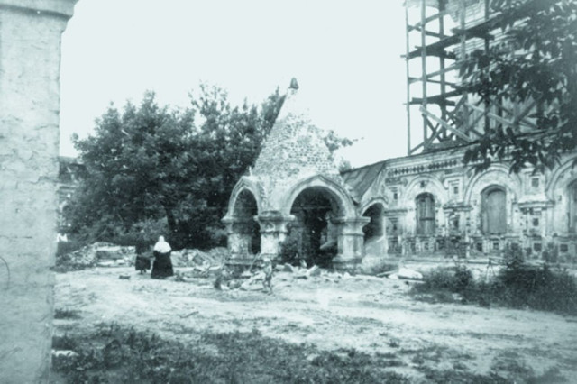 Пока не отыскала то самое место. Но прежде, чем что-то предпринять, написала отцу Науму в Троице-Сергиеву лавру. Батюшка рекомендовал молитвенное правило для сестер монастыря. Когда же мы по благословению владыки Евлогия стали восстанавливать Знаменскую обитель в Коврове (мне был поручен начальный этап ее восстановления), я начала расспрашивать местных жителей о возможном существовании в окрестностях в старые времена православных монастырей. Послушница Ольга (сейчас она инокиня Богородице-Рождественского подворья Дорофея) назвала такое место. Однако выбравшись туда зимой, мы, практически, ничего не увидели. А вот в следующую нашу поездку летом, накануне празднования памяти святой равноапостольной княгини Ольги, я сразу поняла, что это и есть тот участок земли, который привиделся мне во сне. Правда, выглядел он ужасающе. Раньше там базировалась МТС, поэтому земля пропиталась бензином, машинным маслом и была утрамбована колесами тракторов. Приметили мы в лесосеке заросший полуразрушенный храм, направились к нему. Рядом с храмом паслись домашние козы, а сам храм внутри оказался завален химическими удобрениями. На границе этого участка проживал местный фермер. Встретившись с ним, мы побеседовали о заброшенном участке. Представьте себе, он задал те же вопросы, что и дедушка в моем памятном сне. Фермер тоже поинтересовался: «Вы что, монастырь собираетесь тут строить?» А самое интересное, пожалуй, началось, когда мы взялись «копать» архивы. Нашли в них сведения об этом храме, построенном «в русском романтическом стиле». (Благочинный с удивлением мне сказал: «Шесть лет мимо ездил и не видел здесь церкви!»)