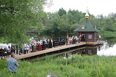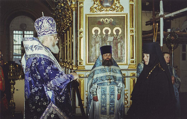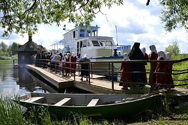 Ее забыть невозможно, как и те трудности, что предваряли службу и разрешились чудесным образом. Август 1992 года. Мы собирались отправиться в разрушенный монастырь на катере, но в то время горели леса и такой смог спустился на город, что плыть было невозможно. Два часа простояли на пристани с Чашей, просфорами и подумали уже, что службу отменим. У меня с собой была Смоленская икона Божией Матери на металле – маленькая, старинная, я всегда ее раньше брала в путешествия. И эта первая Литургия после нашего приезда должна была состояться как раз на Смоленскую. На пристани все заволокло дымом, мы устали, и попросили капитана разрешить нам пройти на катер, чтобы немножко отдохнуть. Он так смешно сказал: «Ладно, кто в платочках, заходите». Спустились мы в каюту, повесили на гвоздик мою иконочку и начали служить молебен. Через десять минут появляется удивленный капитан и говорит: «Туман рассеялся, плывем». Несколько лет потом он возил нас бесплатно, настолько его впечатлила эта история. А у нас на первых порах вообще ни копейки не было, и такое благодеяние с его стороны мы воспринимали с благодарностью. Вот в память об этой Литургии в центральном иконостасе нашего Вознесенского собора, который нам в Троице-Сергиевой лавре прекрасно написали, слева от Царских врат – Смоленская икона Божией Матери. Работа иконописца Екатерины Чирковой – ну просто музейная!