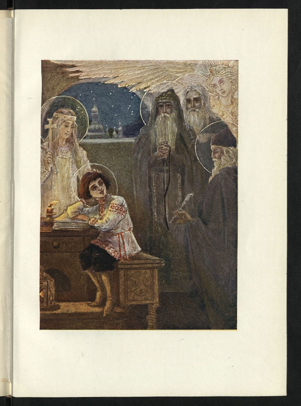 В рисунке «Отрок Даниил – будущий святитель Ростовский» совсем другой подход. Здесь время как бы спрессовано: святитель Димитрий Ростовский показан в начале своего пути, в постижении грамоты и основ веры, но угадывается и его будущее служение – составление сборника житий святых.