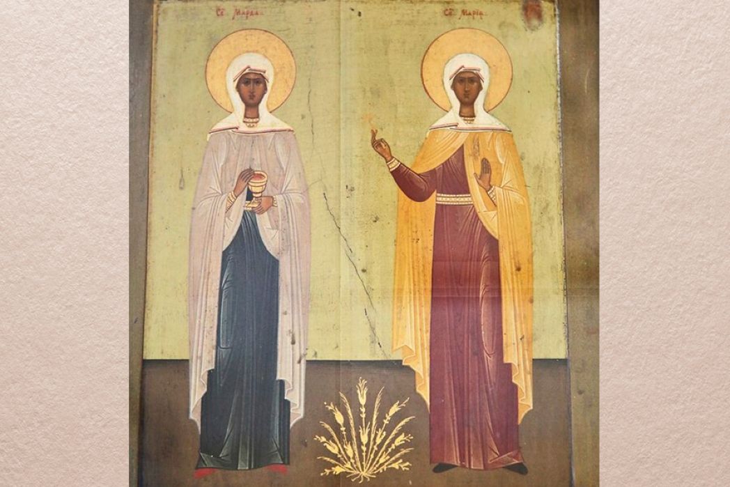 Икона «Святые праведные Марфа и Мария». Традиционно Марфу и Марию в церковном искусстве изображают в сцене «Воскрешение Лазаря». В более позднее время, в Синодальный период, в храмах появляются росписи в академическом стиле, раскрывающие сюжет «Христос в гостях у Марфы и Марии». Но можно, пожалуй, сказать, что именно с Марфо-Мариинской обители получили распространение отдельные изображения праведных сестер. Великая княгиня Елизавета Феодоровна и сама не раз обращалась к ним и в шитье, и в иконе. В иконе она прибегает именно к традиционному языку церковного искусства, ее образы утонченны, одухотворены, работа гармонична по цвету.