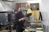 Кухня – это «особо охраняемая территория». Без благословения сюда не смей и заглядывать. Мы здесь вместе с иеромонахом Гермогеном. В режиме «2 через 2» на кухне трудятся 60 человек – профессиональные повара (миряне) и трудники, которые просто хотят поработать в Лавре или поступить в братию. Рабочий день в кулинарном цеху начинается в 7 утра. Если нужно, приходят к 6. Конец работы – после ужина, то есть где-то в 8 вечера. В смене шесть поваров. Завтрак готовит один повар, ужин – тоже один. Но обед – дело серьезное: ну-ка все шестеро, принимайтесь-ка за работу! Вот вам разделение труда: холодный цех, горячий, рыбный, корнечистка... В хлебном – аромат сногсшибательный!