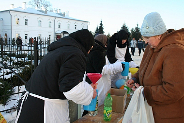Поскольку монастырь древний и в нем находится великая святыня – мощи преподобной Евфросинии, – сюда приезжает много паломников и экскурсий. Некоторые послушания сестер связаны с этим служением обители. В приеме паломников сестрам помогают помощники-сотрудники, которые проводят экскурсии, работают в паломнической трапезной, церковных лавках. Тяжелые физические работы выполняют рабочие-мужчины.