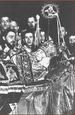 Народ прикладывается к Кресту и Евангелию и целует одежды Святейшего. Сделав земной поклон, я наклонился над гробом Святейшего и попросил открыть руку Патриарха. Стоявший иподиакон исполнил мою просьбу, и я припал к благословлявшей и меня когда-то руке, но теперь лежавшей неподвижно. Рука Святейшего была мягкая, теплая. Не желая задерживать народ, я отошел от гроба к амвону и стал молиться. После панихиды я вошел в алтарь. Архимандрит Нил сообщил мне, что Преосвященный Венедикт находится здесь с четверга, что на Литургию завтра назначено 12 архиереев и 24 священника, среди которых один наш ленинградский протоиерей Пашкевич, что едва ли будет возможно какое-либо изменение утвержденного церемониала, так что обедню мне разрешат служить только где-либо в другом месте, облачение же как приезжему будет выдано. И далее рассказал порядок богослужения на завтрашний день. Духовенство, не участвующее в служении Литургии, собирается в теплом храме, облачается и к 12-ти часам приходит в летний собор и занимает места вокруг гроба.