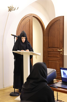 Инокиня Венедикта (Иваненко), насельница Зачатьевского ставропигиального женского монастыря, выступила с докладом «Верность призванию: монашеская жизнь сестер Зачатьевской обители после закрытия монастыря».