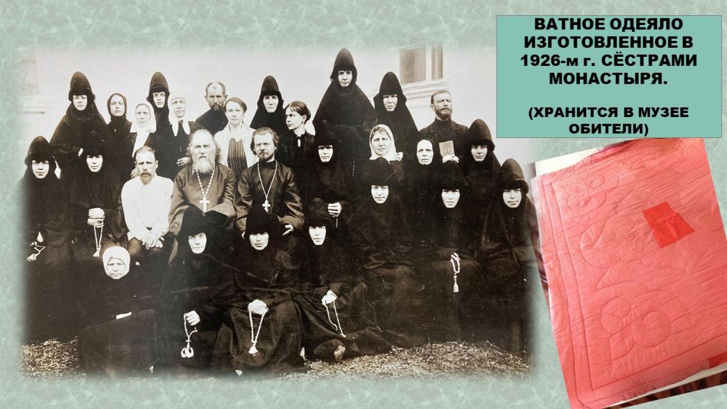 Совсем кратко в докладе монахиня Тавифа напомнила о хорошо известных схимницах – сестрах Крыловых, насельницах Вознесенского монастыря, после его закрытия проживавших в Ивановском монастыре. Родственник сестер Крыловых, филолог Николай Семенович Поспелов (1890–1984), навещал матушек и оставил воспоминания о них в своем дневнике. Схимонахини Серафима и Мария, олицетворяющие женское монашество, изображены на эскизе картины П.Д. Корина «Русь уходящая». После возвращения из Сибири матушки жили у разных добрых людей, а после были приняты в семью Кильдишевых, жившую в окрестностях г. Дмитрова.