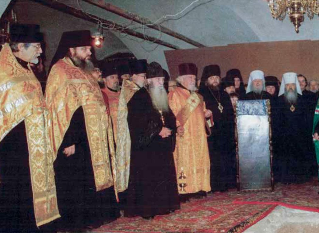 Обретение мощей Святейшего Патриарха Тихона. 22 февраля 1992 г. Третий слева – иеромонах Даниил (Сарычев)