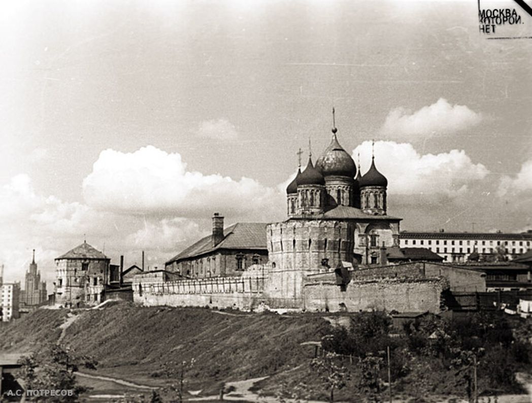 Начали разрушать монастырские стены. Сначала принялись за западную часть со стороны пруда. Одна бригада рабочих ломами отбивала у стен целые кирпичные блоки, а другая лебедкой, установленной у самой воды, стаскивала эти блоки вниз. До войны успели уничтожить стену между северо-западной и средней башнями и верх стены от средней до юго-западной башни. В начале войны были уничтожены все навершия. В подклете собора, в усыпальнице, было оборудовано бомбоубежище. Когда немцы подходили к Москве, жителям было предписано покинуть монастырь, так как собирались в нем сделать опорный оборонительный пункт, но дело кончилось только тем, что был вырыт ДОТ возле стены со стороны площади.