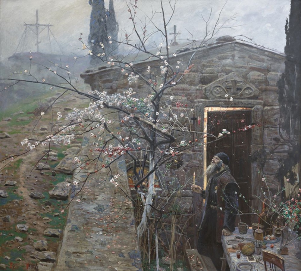 В картине «Пасха» Павла Рыженко – историко-реалистические детали (пейзаж, награда на груди монаха-фронтовика ) перерастают в символическое понимание Пасхи – как огромного События, изменившего человеческую историю, давшего жизнь каменистой и, казалось бы, уже безжизненной почве… От мыслей о победе в войне, через которую прошел герой, художник ведет нас к размышлениям о победе жизни над смертью, и – Жизни над смертью. Но Пасха была бы невозможна без Креста, и монах со свечой в руке, смотрящий с молитвой ввысь, это отчетливо понимает.