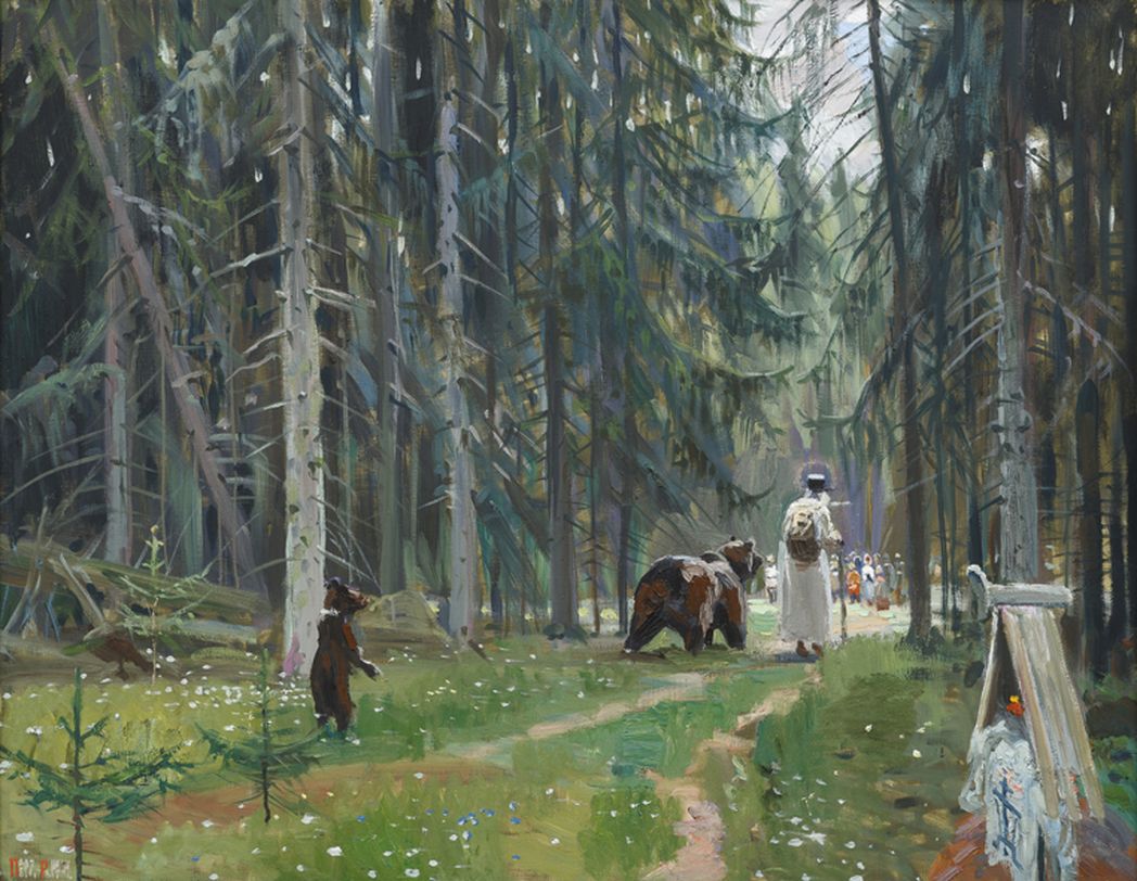 Молитва «звучит» и в картине «Сергий» (2013). Молитва за умерших и живых, за тех, кто находится за ним, и – за всю Россию. Всеобъемлющее значение молитвы святого подчеркнуто бескрайностью окружающего мира, который развертывается за спиной преподобного Сергия. Этой цели служит и мотив дороги, уходящей куда-то влево и теряющейся в пространстве, и высокая, чуть «размытая» линия горизонта.