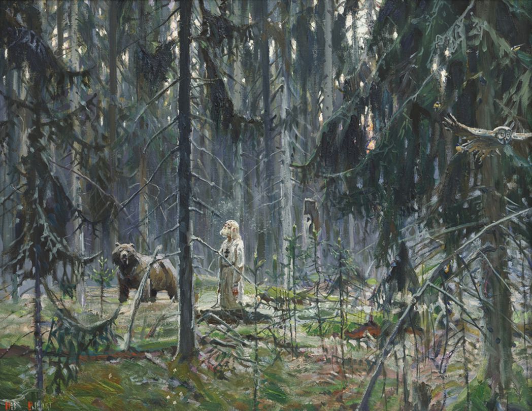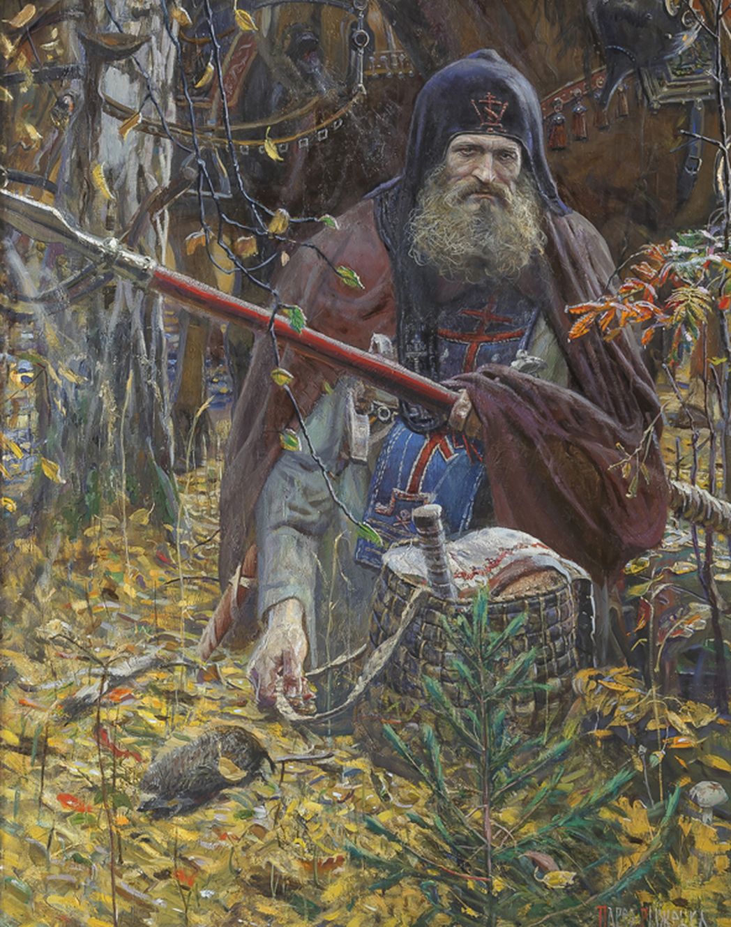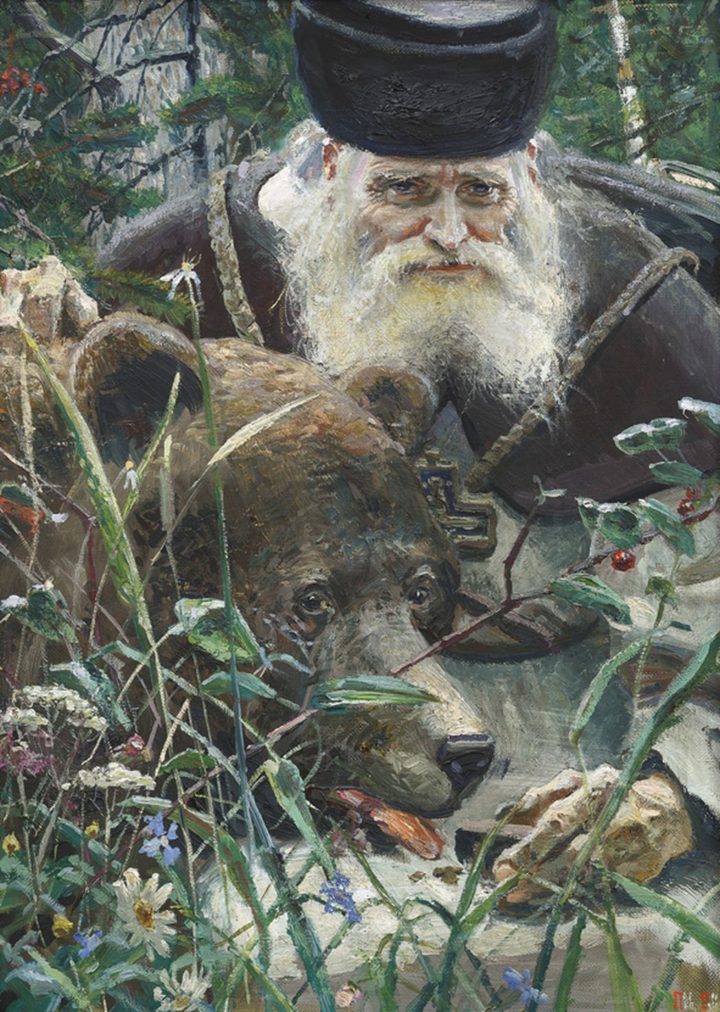 Преподобному Серафиму он посвятил триптих (2006). В центральной работе святой изображен занимающим все изобразительное пространство, даже выходящим за него: если он встанет, то фигуре точно не хватит места на холсте. Тем самым подчеркивается духовная мощь, величие святого. Еще на картине – медведь, собирающийся взять хлеб из рук преподобного, кружево растений – цветов, травы на переднем плане, зелень леса на заднем – все это говорит о гармонии, в которой святой находится со всем окружающим миром. В левой части триптиха – то, что ведет к гармонии, внутренней тишине – сосредоточенная, упорная молитва. И лес на ней уже далеко на такой благостный – колючие сухие ветки елей без иголок, резкое движение совы летящей куда-то вперед – все это заставляет вспомнить о тех искушениях, с которыми сталкивался святой во время своего молитвенного подвига. В первой части триптиха святой выходит к людям. Здесь тоже есть сухие колючие ветки, но они словно расступаются – за спиной преподобного остается широкая дорога…