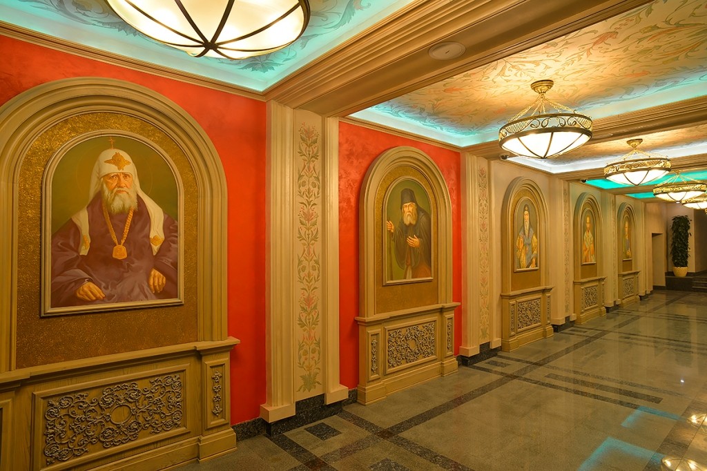 На парадных лестницах большие портреты насельников Сретенского монастыря: патриарх Сергий (Страгородский), митрополит Серафим (Чичагов), архиепископ Иларион (Троицкий), архиепископ Фаддей (Успенский), архиепископ Лука (Войно-Ясенецкий), епископ Вениамин (Милов), епископ Афанасий (Сахаров), епископ Феодор (Поздеевский), архимандрит Серафим (Тяпочкин), архимандрит Иоанн (Крестьянкин), протоиерей Алексей Воробьев, профессор Алексей Федорович Лосев и многие другие.