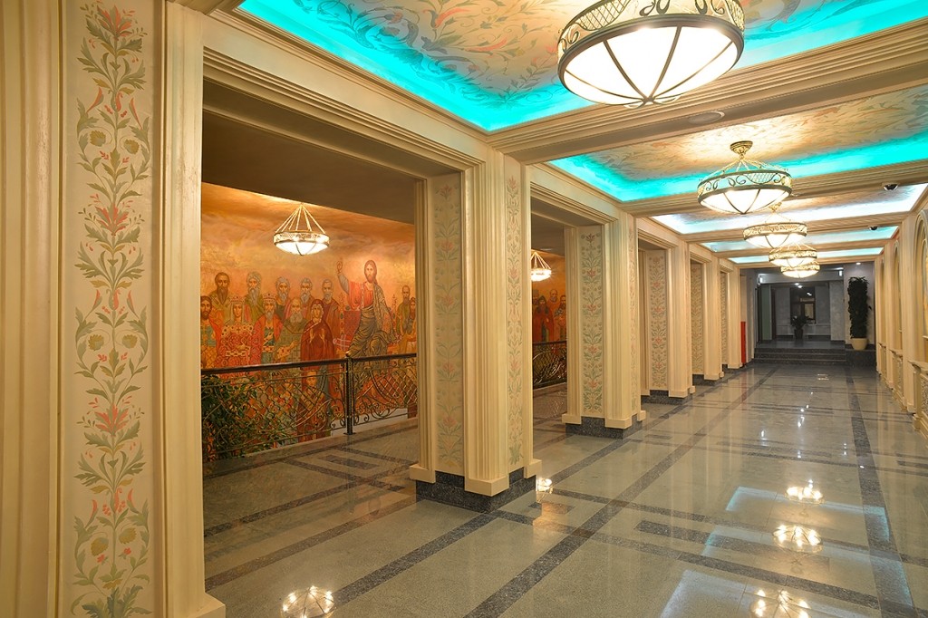 В коридоре на стенах — сенсорные панели. С их помощью каждый семинарист может найти необходимую ему информацию: расписание занятий и богослужений, сведения о преподавателях и выпускниках, историю монастыря и семинарии. А рамами для этих экранов служат орнаменты по мотивам византийских фресок.