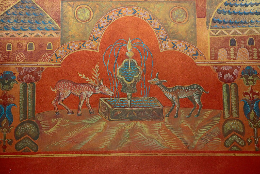 Одна из стен третьего этажа расписана уже знакомыми византийскими орнаментами. Другая — украшена гравюрами с видами русских городов и Сретенского монастыря.