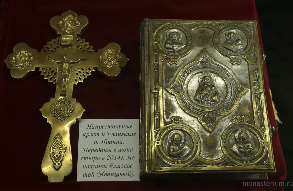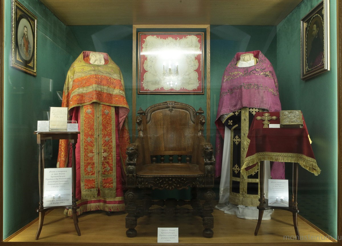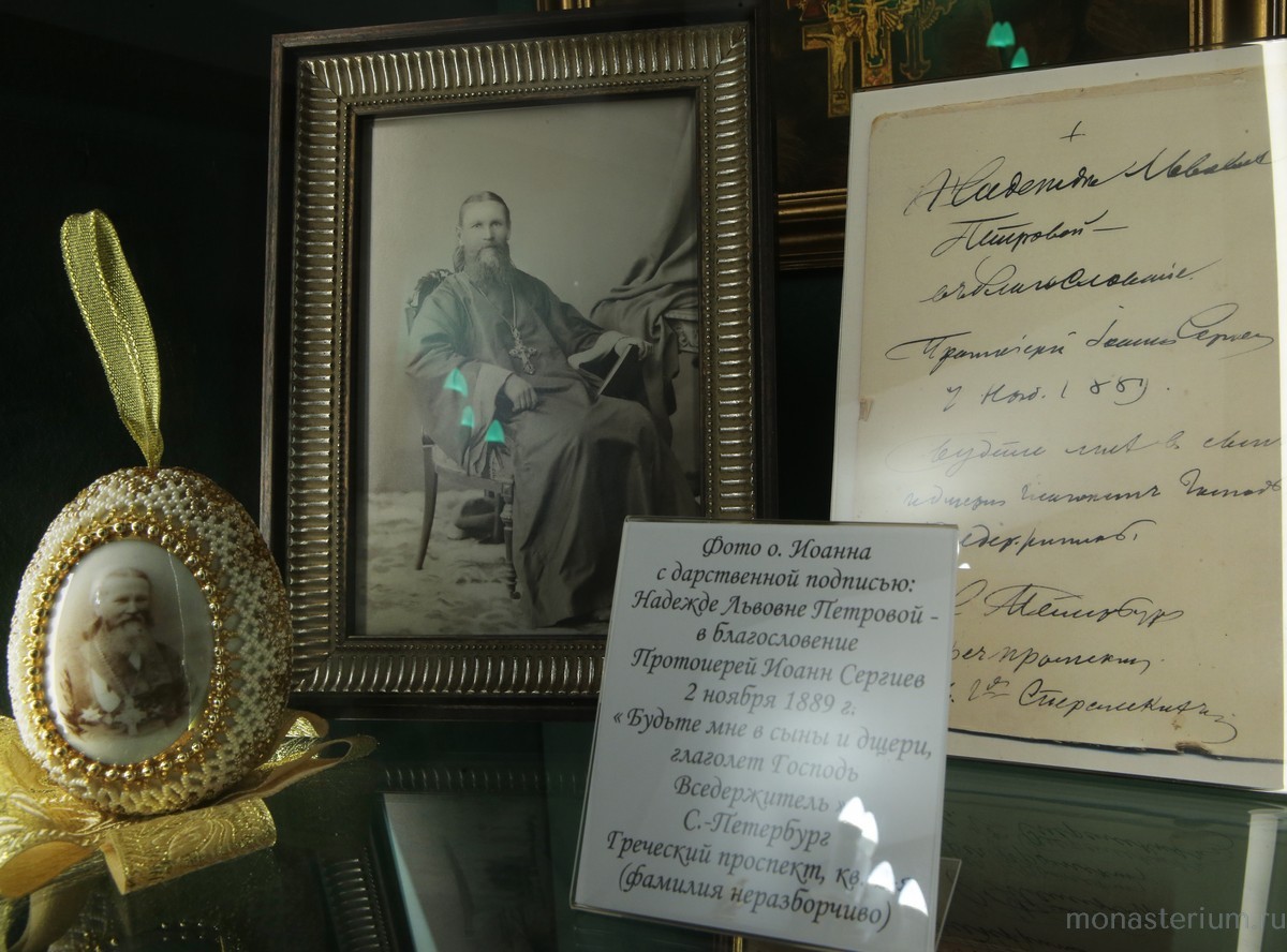 А то кресло отца Иоанна, которое долго хранилось в монастыре, находится теперь во втором зале музея. Если первый зал посвящен Иоанновской обители, то второй – святому праведному Иоанну Кронштадтскому. Во втором зале за стеклянной витриной находятся облачения святого Иоанна Кронштадтского, одно из которых передал в дар Святейший Патриарх Алексий II. Есть здесь и митра Батюшки, и перо, которым он писал, и его письма. Столько разных экспонатов собрано, что о них и тех людях, которым они принадлежали, а также об их родственниках – кровных или духовных, – передавших ценные реликвии Иоанновскому монастырю, можно целую книгу составить!