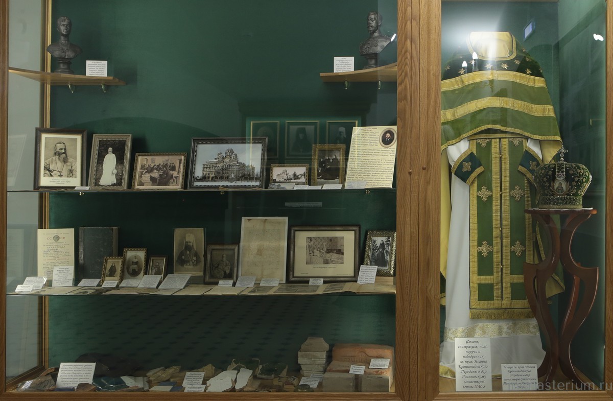 По признанию сестер, музей появился в монастыре несколько неожиданно для них. Небольшая экспозиция в храме-усыпальнице была и прежде: она состояла из фотографий, наглядно показывающих историю монастыря. А рядом, в шкафу, были представлены богослужебные облачения основателя обители – святого праведного Иоанна Кронштадтского. Осенью 2016 года в храме-усыпальнице был начат капитальный ремонт. В советское время во всем здании была нарушена гидроизоляция. При открытии монастыря в храме-усыпальнице стояла вода, которую приходилось откачивать насосом. Влажный климат и близость реки Карповки усугубляли разрушительные процессы: разрушалась кирпичная кладка фундамента и стен подвальных помещений, в храме-усыпальнице стены и пол были мокрыми, местами покрытыми грибком и плесенью. Когда полностью отбили штукатурку, то обнаружились пробитые в советское время ниши (после Великой Отечественной войны здесь устроили бомбоубежище и поделили его на маленькие боксы). Сестры предложили матушке, игумении Людмиле, не закладывать одну из ниш, а сделать в ней небольшой смотровой шкаф. Ведь людям так хотелось увидеть реликвии, связанные с Батюшкой и историей монастыря! В ответ на это матушка игумения неожиданно предложила расширить экспозицию за счет подсобного помещения.
