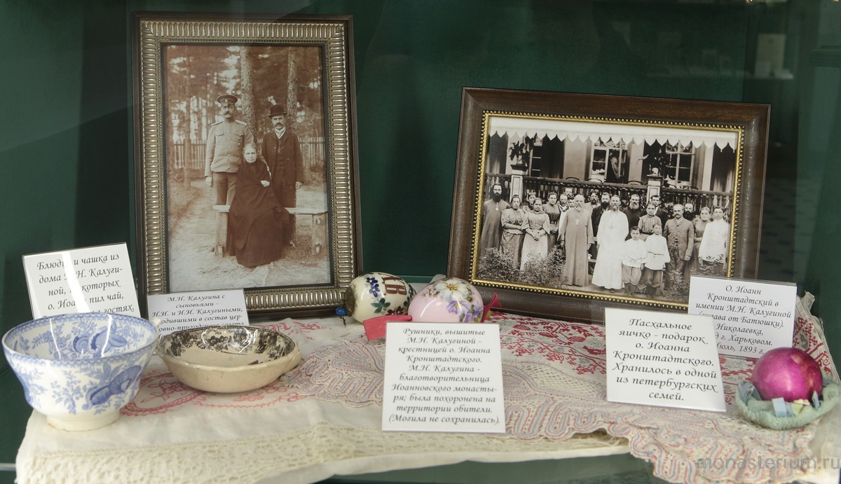 Волнение в душе вызывает и сохраненная в лагерных мытарствах кружечка с портретом отца Иоанна Кронштадтского, помещенная, как уже говорилось, в нише. Такие кружечки были у всех насельниц обители на трапезе. Эта – теперь уже музейный экспонат – принадлежала монахине Ангелине (Осиповой), чью судьбу тоже нельзя обойти вниманием. Благословляя ее в монастырь, Батюшка произнес: «Мы с тобой и слепенькие проживем». После возвращения из ссылки она вернулась в тот город, откуда была родом, – в Тутаев. Там, полностью ослепнув, прожила многие годы. Как и предсказывал отец Иоанн... Ходила в открывшийся Воскресенский собор, была певчей. Любила, когда ей читали, знала наизусть службу. Умерла в 1965 года. Ее духовная сестра при открытии Иоанновского монастыря передала эту кружечку сестрам и рассказала все, что знала об одной из их предшественниц.