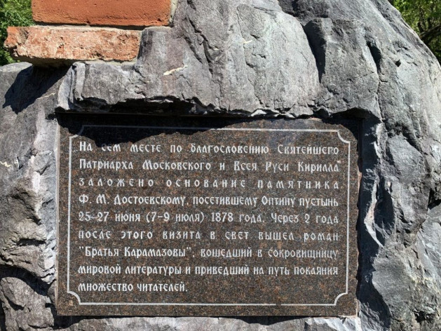 В день открытия «Дней Достоевского в Оптиной пустыни» был заложен памятник великому русскому писателю. Как отметил Игорь Леонидович Волгин, вице-президент международного фонда Ф.М. Достоевского, в какой-то степени этот камень символизирует и камень у могилы Илюши из романа «Братья Карамазовы», у которого Алеша произносит речь о всеобщей любви. Так и у стен монастыря, красота и сила которого заключается в братской любви как сокровенной части жизни монашествующих, будет воздвигнут памятник писателю, перо которого оставило самый значимый след в художественной литературе об Оптинской обители.