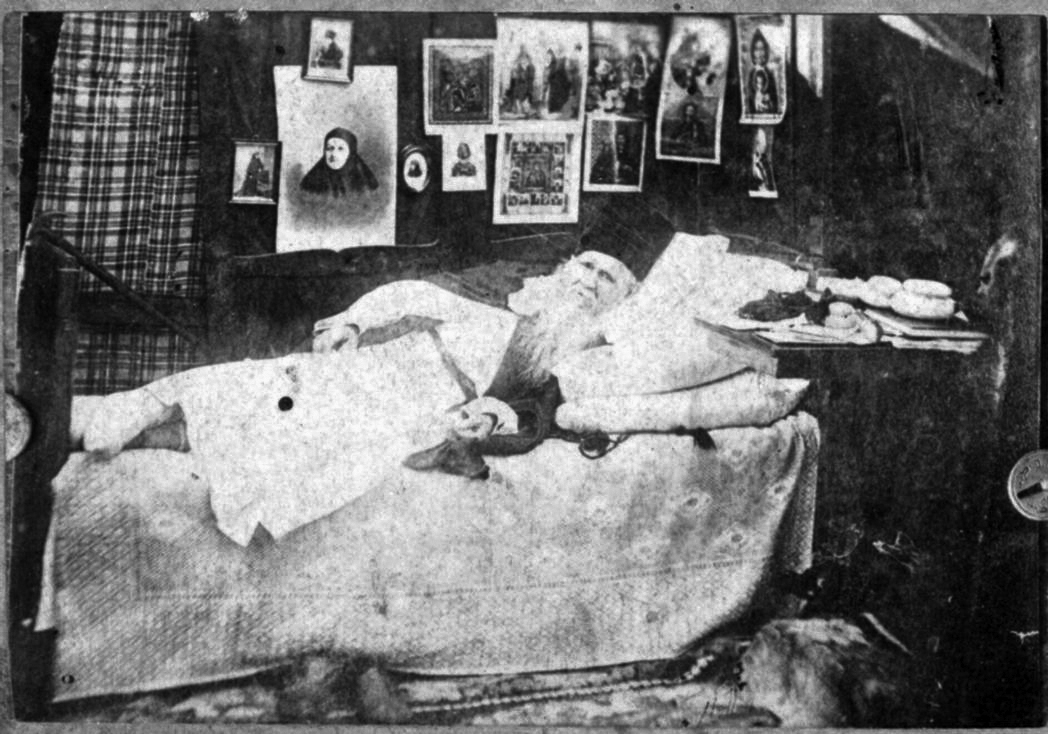 Батюшка, как всегда, полулежал. Один келейник стоял впереди у образа и читал, а другой – позади батюшки. Вдруг он видит, что отец Амвросий садится на кровати, затем поднимается на десять вершков, отделяется от кровати и молится в воздухе.