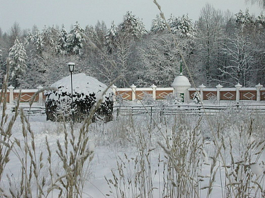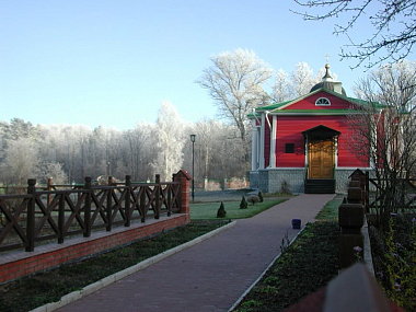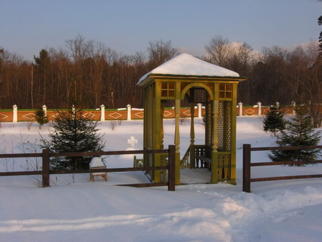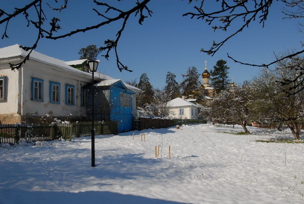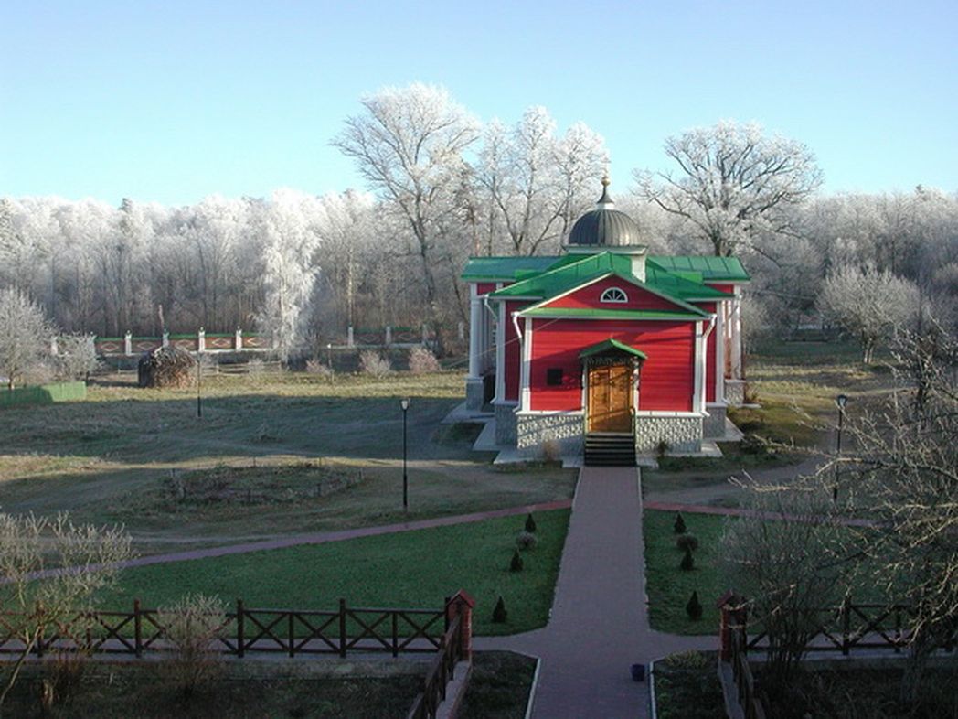 Скит и колодезь во имя Амвросия Медиоланскаго возникают впереди перед нами неожиданно и радостно. В благоговении стоим перед Святыми вратами и молимся. Справа от них – хибарка старца Амвросия, знаменитое крыльцо, перед которым в ожидании приема и получения духовного совета собирались многочисленные богомольцы.