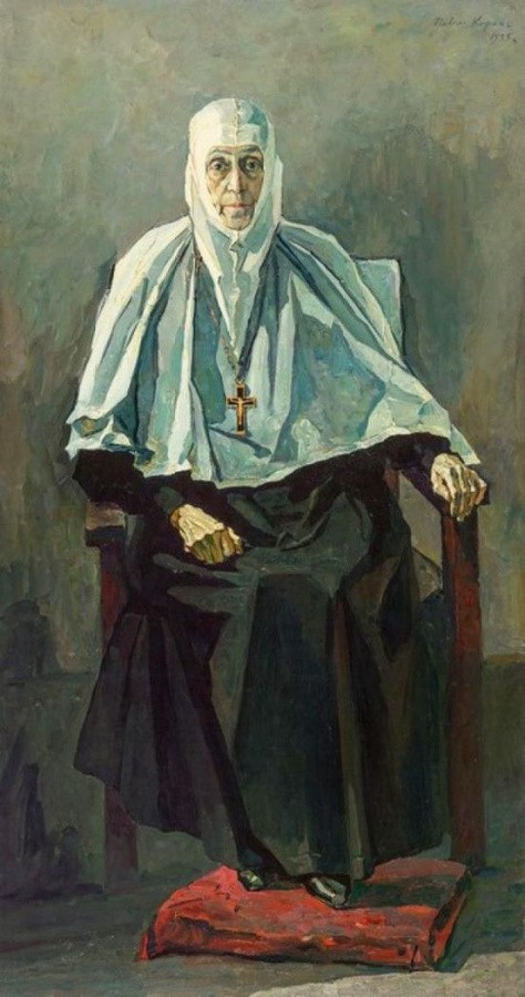 В портрете Павла Корина нет и намека на телесную немощь матушки, хотя чувствуется след от перенесенных страданий… Чуть ссутуленные плечи, легкий упор на одну руку – все это замечаешь, разглядываешь уже потом, тем более зная, что схиигумения Фамарь плохо себя чувствовала из-за болезни и всех, приезжающих к ней, принимала, сидя в кресле. Первое впечатление от образа – перед нами человек, которого не согнуть, не сломать. Глубокий взгляд больших глаз, почти иконных. Да, и на фотографиях, в том числе времен молодости, у матушки большие глаза. Но Корин специально делает на них акцент, как и на все лицо, очерчивая его белым апостольником. Именно лицо, глаза – все это полно движения, передает, при внешней статичности образа, напряженную духовную жизнь. Переходы от света к тени ярко выражены, не сглажены: если художник пишет свет, то почти близко к белому, если тень – к темному, что усиливает ощущение напряженности. Цвет в картине сведен к минимуму, и это тоже помогает идее – подчеркнуть внутреннюю, духовную жизнь героини.