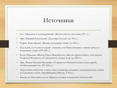 Теперь, после такого пространного вступления, мы с вами попробуем рассмотреть то, что связано с собственно древними монахами. Прежде всего должен сказать два слова о дошедших до нас источниках, описывающих древних монашествующих лиц. Классическим, наиболее известным и повсеместно распространенным уже в IV веке является такой памятник христианской письменности, как «Житие святого Антония». Жизнь этого подвижника описал святитель Афанасий Александрийский. Другим известным памятником рассматриваемого периода являются Беседы преподобного Макария Египетского. Они в основном описывают жизнь в скиту. Также, помимо первоисточников, мы до наших дней сохранили и имеем перед собой свидетельства путешественников, которые посещали монахов. Такими путешественниками, которые от года до семи лет скитались по Египту, жили или в скиту в Нитрийской пустыни, или встречались со святым Антонием, или слышали о нем что-либо, являются, например, Руфин Аквилейский и Палладий, епископ Еленопольский. Они оставили нам сочинения «Жизнь пустынных отцов» (Руфин) и «Лавсаик, или повествование о жизни святых и блаженных отцов» (Палладий). Эти сочинения дошли до нас отчасти в латинском переводе, в частности Руфин.
