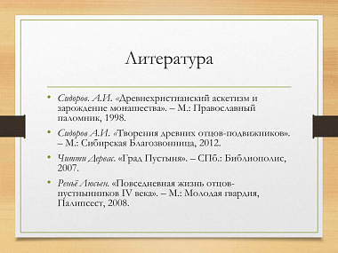 • Сидоров А.И. Древнехристианский аскетизм и зарождение монашества. – М.: Православный паломник, 1998.
