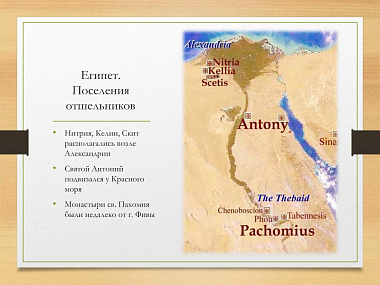Монастыри святого Пахомия Великого находились в верхнем течении Нила. Их было 11 – девять мужских и два женских. Первым местом, где основал монастырь святой Пахомий, была Тавенниси (Тавенна), потом Боу и Хенобоскион. В Тавенниси он, собственно, подвизался и руководил этим монастырем. Второй монастырь, который в свое время стал главным, – Боу – находится рядом. Все эти места нам важно географически представить. Также мы, я думаю, должны ознакомиться с тем, как близко (или, скорее, далеко) друг от друга располагались Нитрийская пустынь и Келлии, потому что часто эти места в современном представлении путешественников и паломников смешиваются.