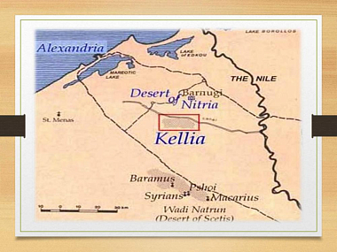 Места, которые связаны с Нитрийской пустынью, с Келлиями и Скитом, располагаются вблизи от дельты Нила, недалеко от Александрии. В 40 километрах от Александрии находится Нитрия, примерно в 18 км – Келлии, и на расстоянии ночного перехода (днем, как правило, не путешествовали: в пустыне легко заблудиться, поэтому путешествовали ночью по звездам, к тому же днем было жарко) находились и хижины тех, кого называли скитянами. Они жили в месте под названием Скит.
