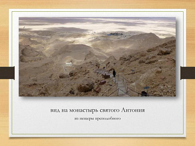На фотографии, сделанной приблизительно с места расположения кельи святого Антония, с середины горы, в которой он, собственно, и жил, – вдалеке виднеется небольшой оазис, рядом с которым и располагается монастырь святого Антония. Это, в частности, является материальным свидетельством того, что, в принципе, источник воды был недалеко от места подвига преподобного, но пустыня вокруг Антония была абсолютно безжизненна, как и сейчас.