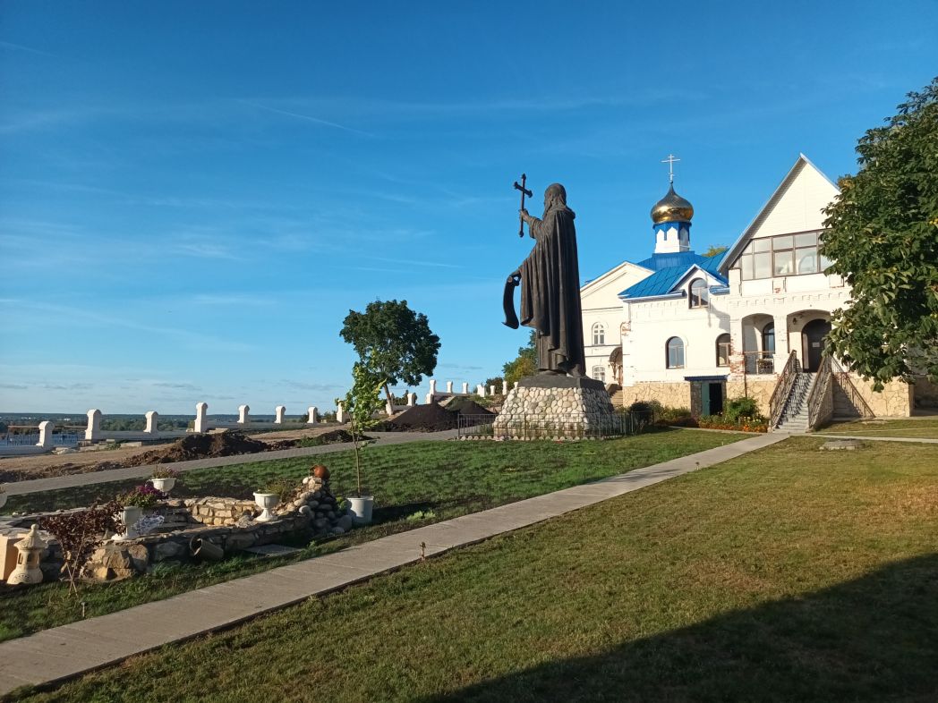 Говорим о строительстве: игумен Амвросий показывает новую ограду, балкончик, смотровую площадку, вид с которой на Свияжск и просторы завораживает.