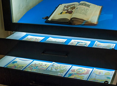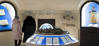 На первом этаже музея (точнее – полуподвальном), расположен уникальный макет монастыря в древности. На нем можно увидеть еще старые, не перестроенные храмы. И колокольню на том месте, где она была раньше. И корпуса братских келий в дальнем углу монастырской территории. Сейчас многое географически поменялось… А в нишах этого круглого зала находятся такие раритеты, которые вызывают душевный трепет. Самый древний из них – двухстворчатая панагия митрополита Лаврентия конца XVII века, вскрытая то ли консервным ножом, то ли просто острым ножом: видимо, богоборцы искали в ней драгоценности. По рассказу отца Гавриила, есть серьезное исследование, где рассматривается вопрос, что митрополит Казанский и Свияжский Лаврентий (он не только дал благословение на основание монастыря, но и принял самое живое участие в деле его устроения) носил древнюю панагию – возможно, что даже XIV века. Дальше – подлинное издание толкования святителя Андрея Кесарийского Апокалипсиса (Откровения святого апостола Иоанна Богослова), относящееся к первой половине XVII века. Оно украшено цветными гравюрами, и подсветка ниши усиливает впечатление. К слову, о трудах святых отцов и учителей Церкви. В Житии преподобного Иоанна Лествичника говорится, что знаменитую «Лествицу» – руководство для восхождения к духовному совершенству – святой, управлявший в то время монастырем, написал по просьбе собрата – игумена из Раифского монастыря, обратившегося к нему от лица всех иноков своей обители.